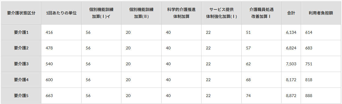 | 要介護状態区分 | 1回あたりの単位 | 個別機能訓練 加算(Ⅰ)イ |