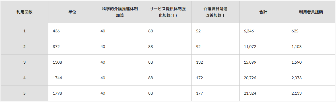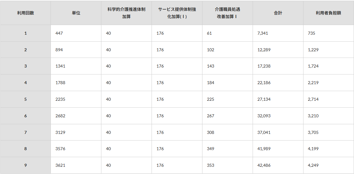 | 利用回数 | 単位 | 科学的介護推進体制加算 | サービス提供体制強化加算(Ⅰ) | 介護職員処遇 改善加算Ⅰ |